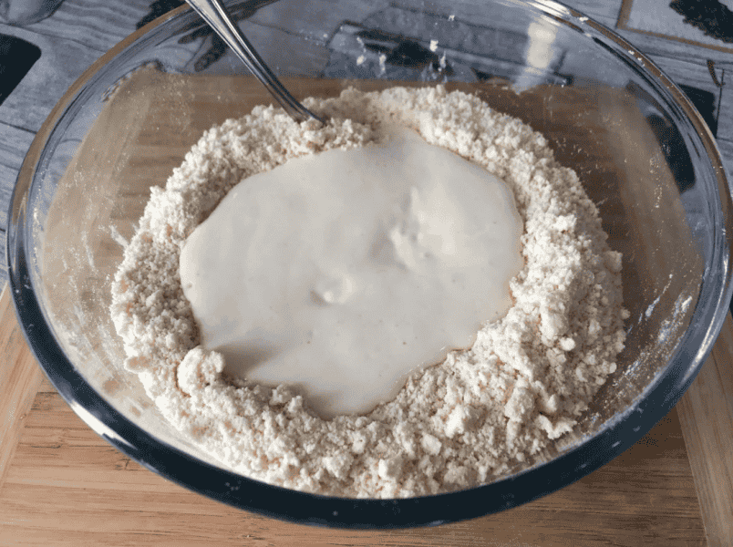 У центрі масляній крихті робимо невелике заглиблення та вливаємо рідкі інгредієнти. Замішуємо тісто спочатку вилкою, а потім руками, збираючи тісто в одну грудку.