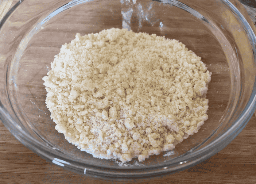 Для другої начинки змішуємо борошно з цукром та ванільним цукром і додаємо шматочки холодного вершкового масла. Перетираємо в крихту виделкою або руками.