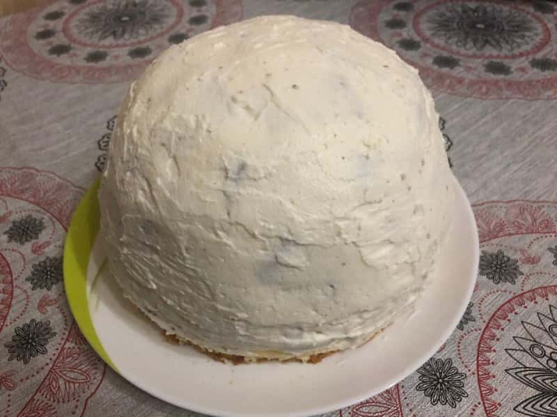 Зверху обмотуємо торт харчовою плівкою і прибираємо в холодильник на 2 години. Можна на ніч.