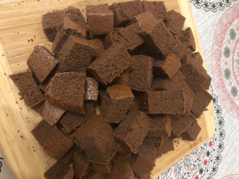 Охололий шоколадний бісквіт розрізаємо на шматочки приблизно 2 см.
