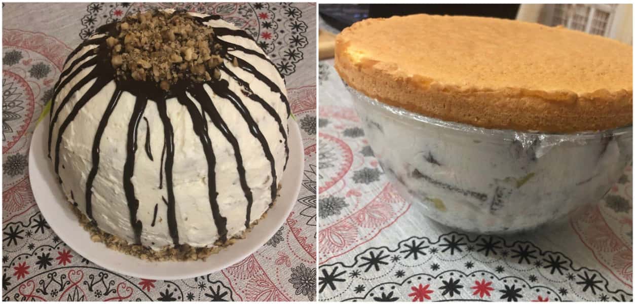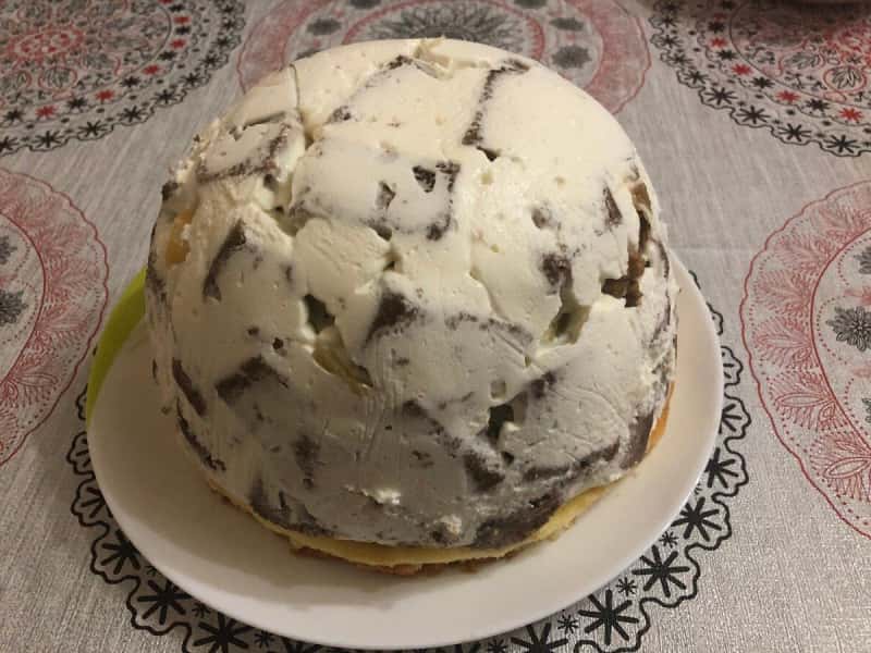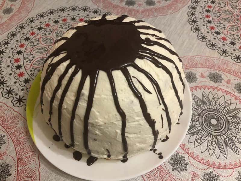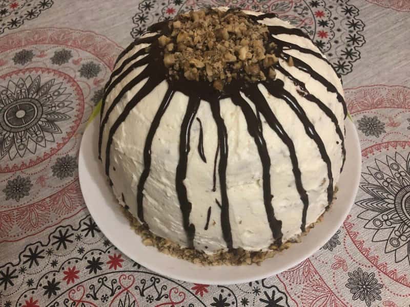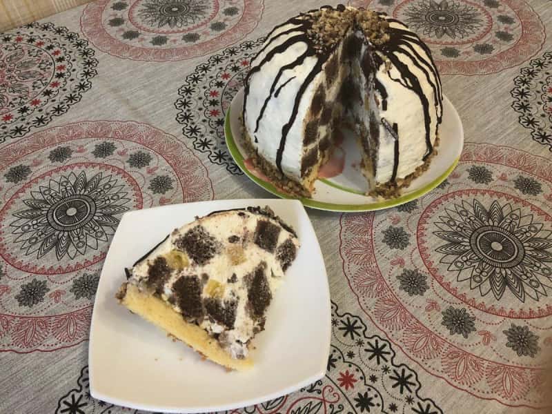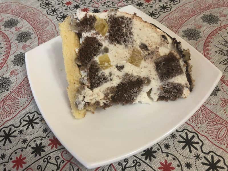 Варіанти складання два. 1 варіант: на світлий корж, просочений ананасовим соком, укладаємо шоколадні шматочки, кожен з яких обмакуємо в сметанний крем і формуємо гірку – купол. Кожен шар прокладаємо шматочками ананаса і посипаємо волоськими горіхами. Зверху змащуємо залишками крему і поливаємо глазур’ю.