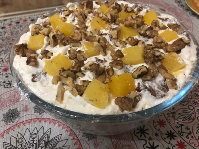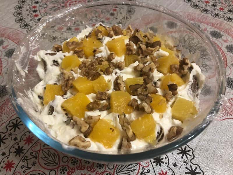 Тепер обмакуємо шматочки шоколадного бісквіта в кремі і кладемо в миску, перекладаючи шматочками ананаса і волоськими горіхами. Так формуємо шар за шаром.