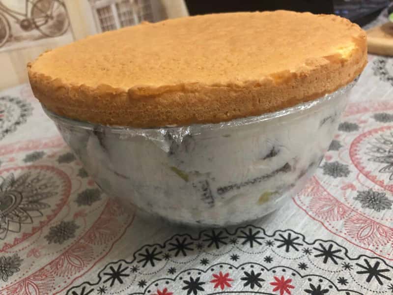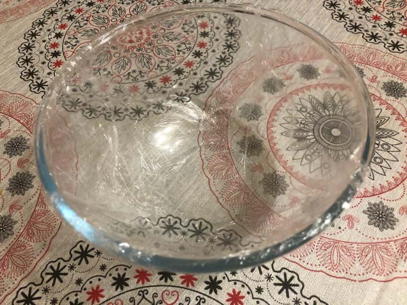 Беремо глибоку миску, об’ємом приблизно 2-2,5 літра і вистилаємо всередині харчової плівкою. Ось так.