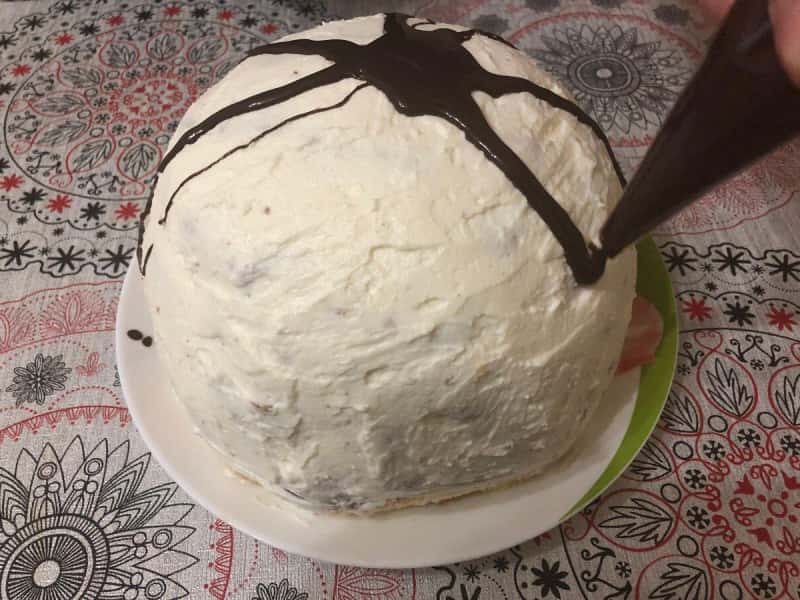 Дістаємо наш торт з холодильника і остиглою глазур’ю поливаємо його. Зверху прикрашаємо подрібненими горішками. Прибираємо в холодильник ще на 3 – 4 години для повного просочення. Можна на ніч.