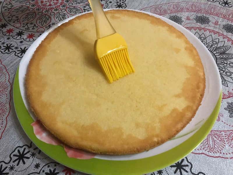 Світлий корж – основу просочуємо ананасовим сиропом з банки.