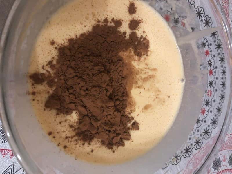Далі додамо 3 ст. л. какао в час, в тісто що залишилося. Перемішаємо.