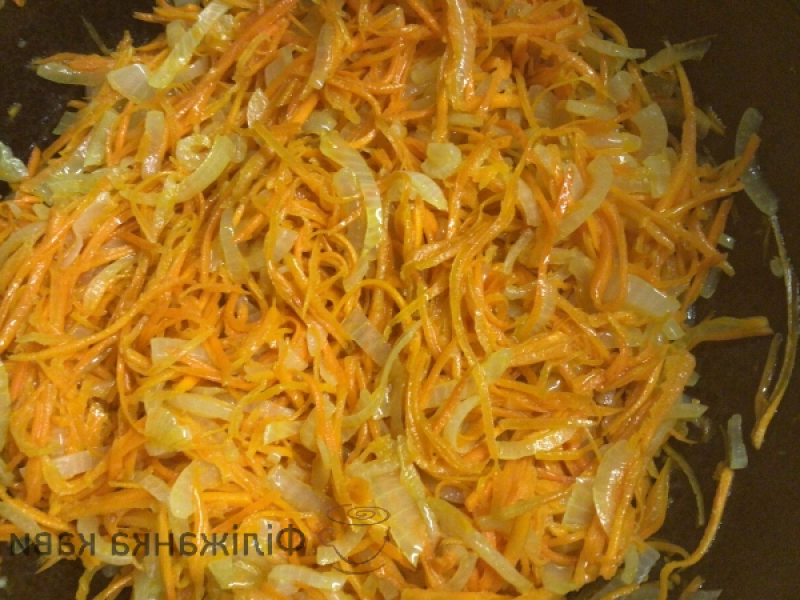 - Потім в обсмажену цибулю додаємо моркву, перемішуємо і не зменшуючи вогню, обсмажуємо до моменту, поки морква не стане м’якою.