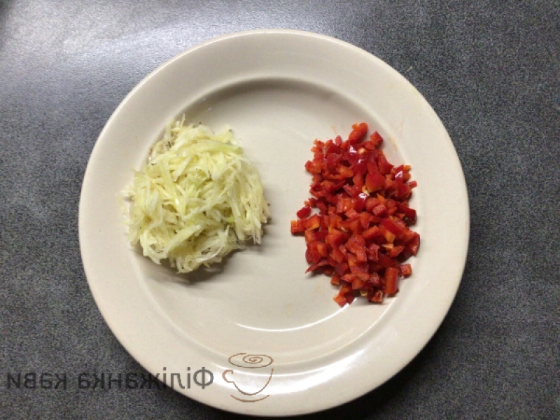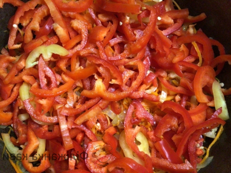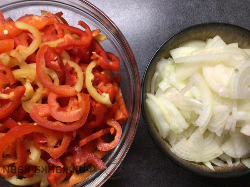 - Нарізаємо тонкою соломкою солодкий перець. Ріпчасту цибулю 1/4 кільцями.