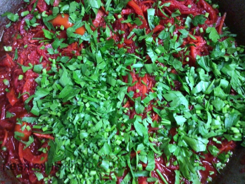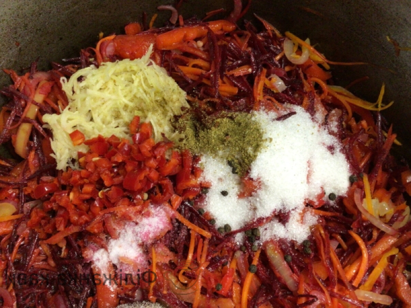 - Потім додаємо протерті томати, спеції ( часник, пекучий перець, сіль, запашний горошок, лавровий лист, хмелі – сунелі, цукор ), наливаємо оцет 9%.