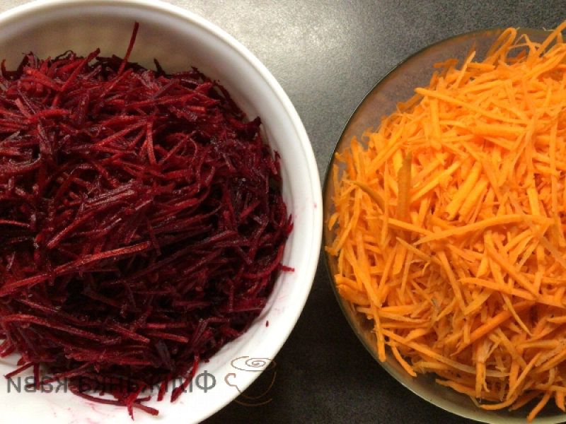 - Моркву і буряк шинкуємо на терці для корейської моркви.