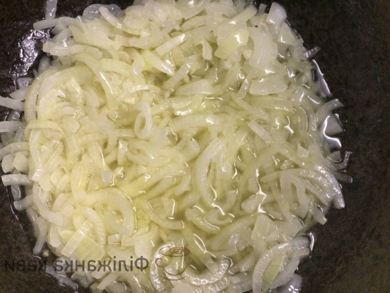 - Велику каструлю або казан ставимо на плиту, наливаємо олію. У розігріту олію викладаємо цибулю і на сильному вогні, обсмажуємо до злегка золотистого кольору.