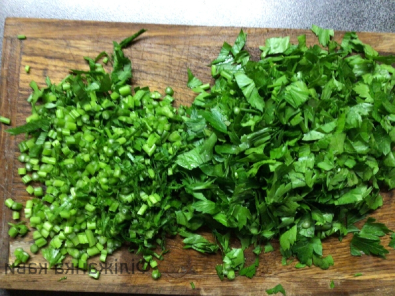 - Нарізаємо дрібно зелень. Зелень в приправу використовую не тільки листочки, але і стебла.