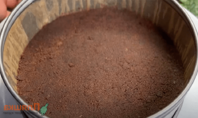 Печиво перемелюємо блендером у крихту, додаємо вершкове масло. Печиво можна взяти будь-яке пісочне – шоколадне чи звичайне. На свій смак. Можна додати до звичайного печива і масла розтоплений шоколад – це посилить смак десерту, або какао ложку.