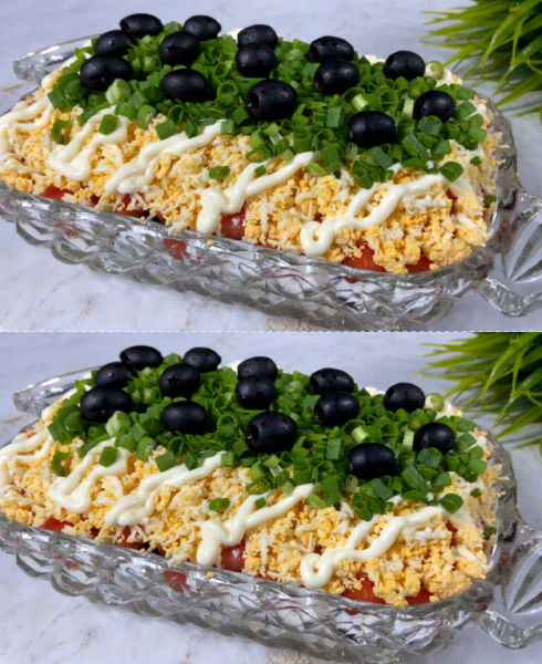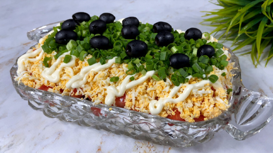 7. Прикрашаємо салат зеленою цибулею та консервованими маслинами, прибираємо в холодильник на пару годин і подаємо до столу.