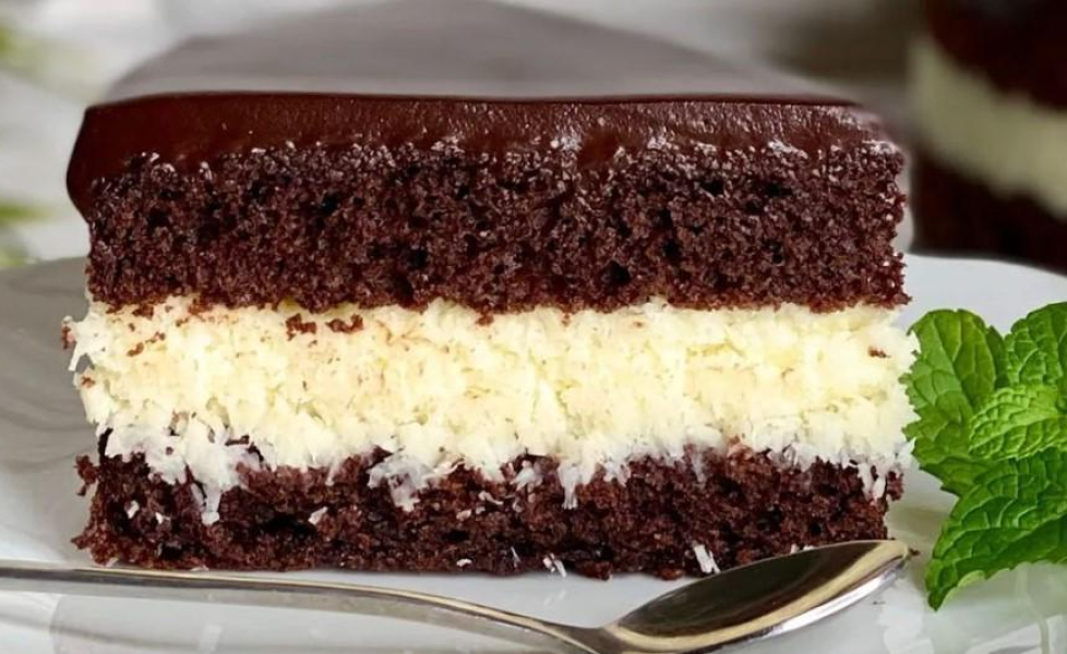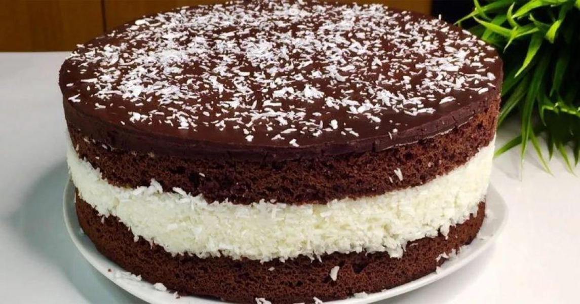 Ошатний торт з ніжною кокосовою начинкою і глянсовою шоколадною глазур’ю готовий! Потрібно лише нарізати його, подати до столу та спостерігати, з яким задоволенням його їдять.