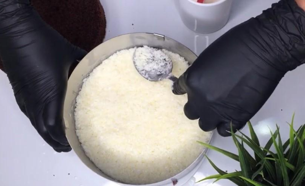 Зверху викладіть кокосову начинку, акуратно розрівнюючи її. Просочіть другий корж вершками, що залишилися. Викладіть його на начинку і трохи придавіть.