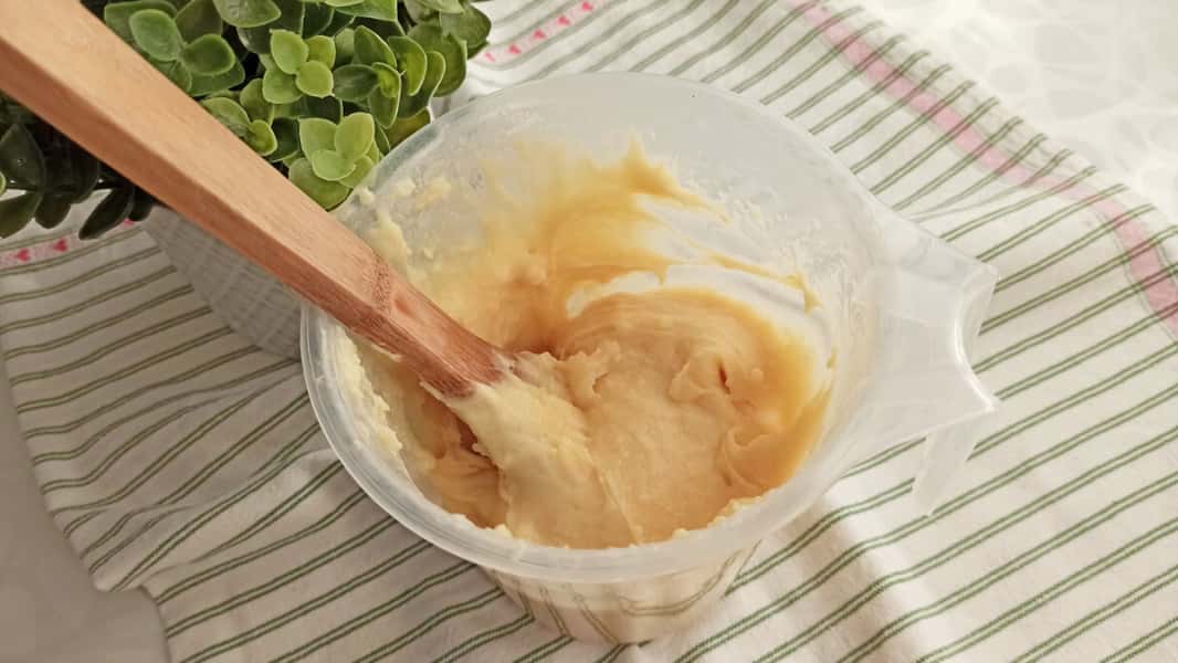 4. В результаті заварне тісто має вийти гладким і однорідним. Ідеальна консистенція заварного тіста — це коли воно звисає з лопатки трикутником з гострим «язичком».