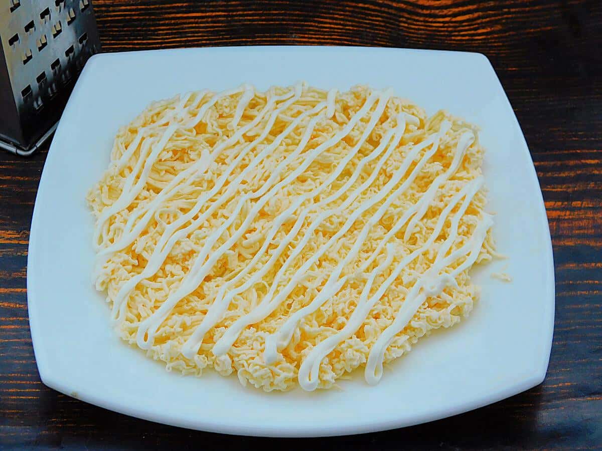 Плавлені сирки дістати з морозилки і подрібнити на терці прямо на миску, на якій будете збирати салат ( на цей шар використовувати половину сирків. Нанести тонку сітку з майонезу.