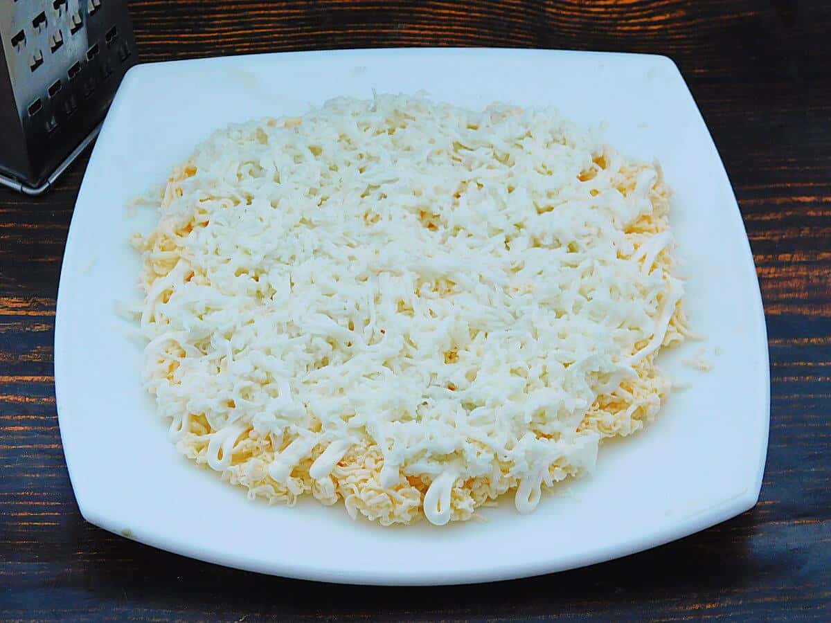 Повторити всі шари в зворотному порядку, укласти моркву, білки, що залишилися сирки. На кожен наносити тонку майонезну сітку. Натерти твердий сир.