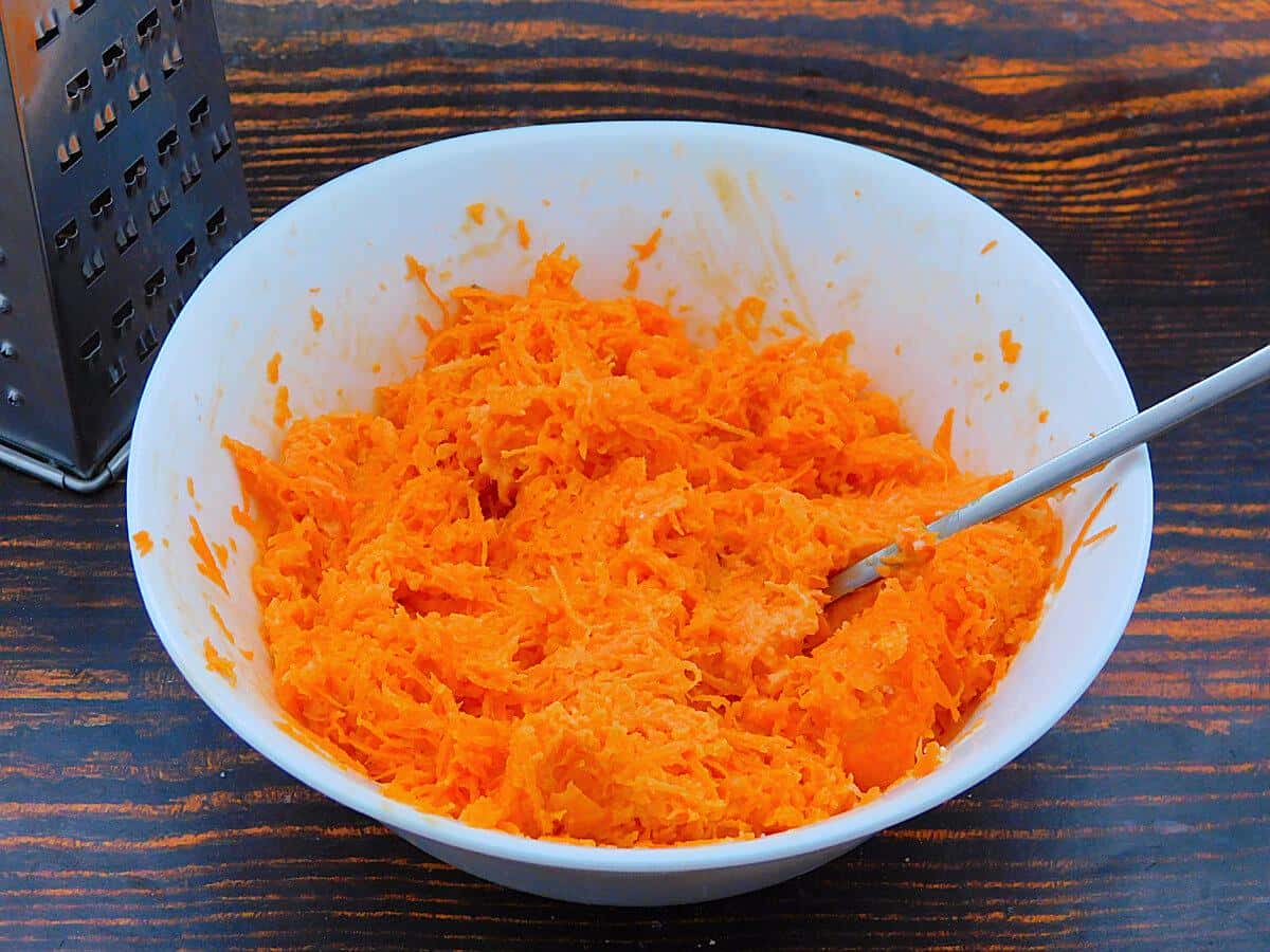 Сиру морквину натерти на дрібній терці, додати пропущений через прес часник і ст. ложку майонезу.