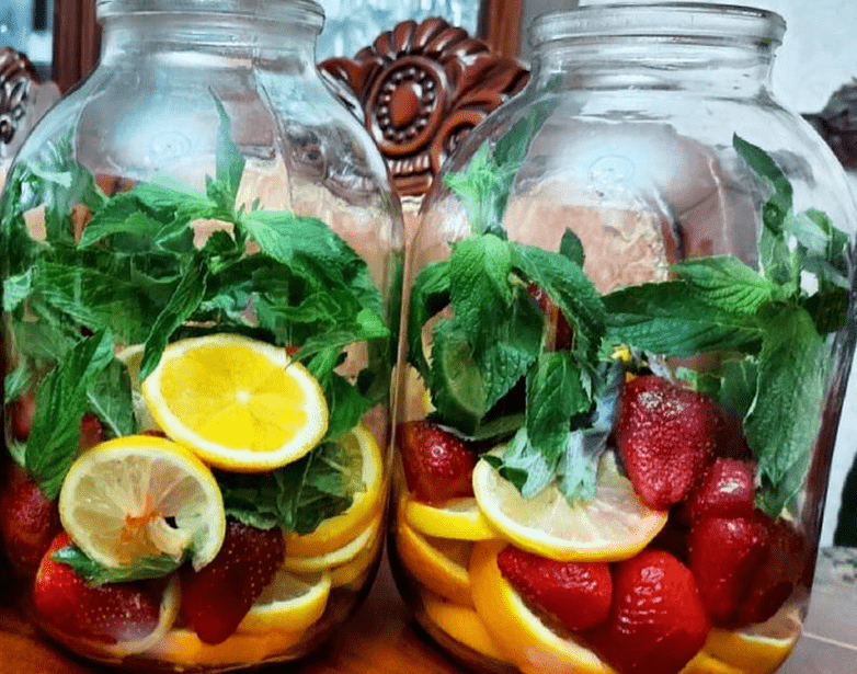 - В стерильну трилітрову банку покладіть декілька листочків м’яти, три шматки лимона та ягоди полуниці.
