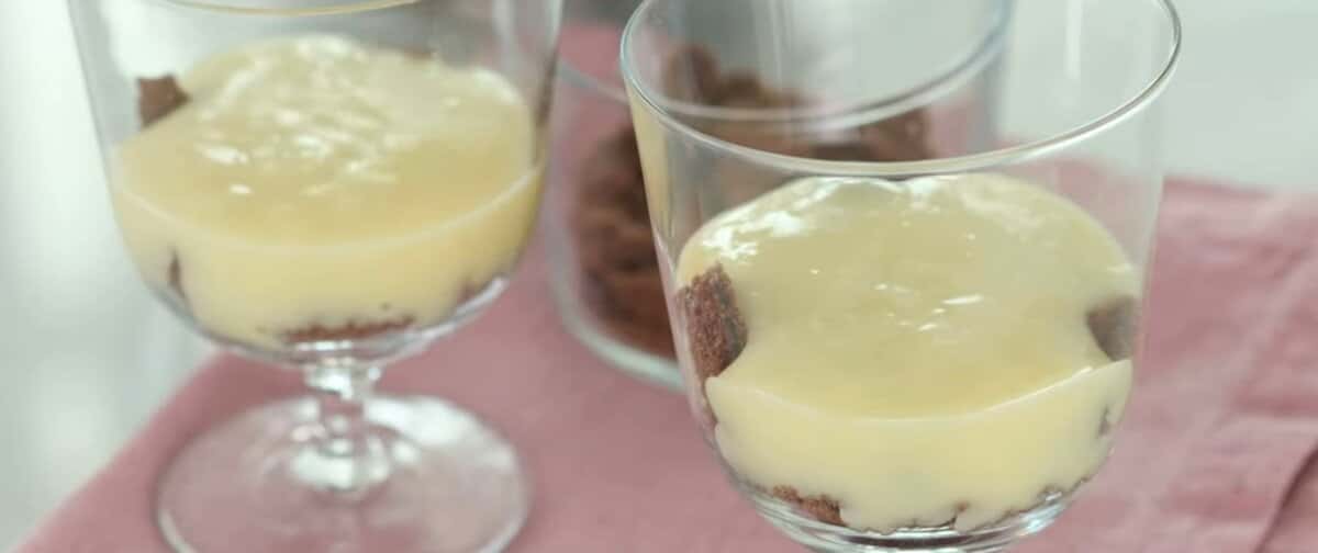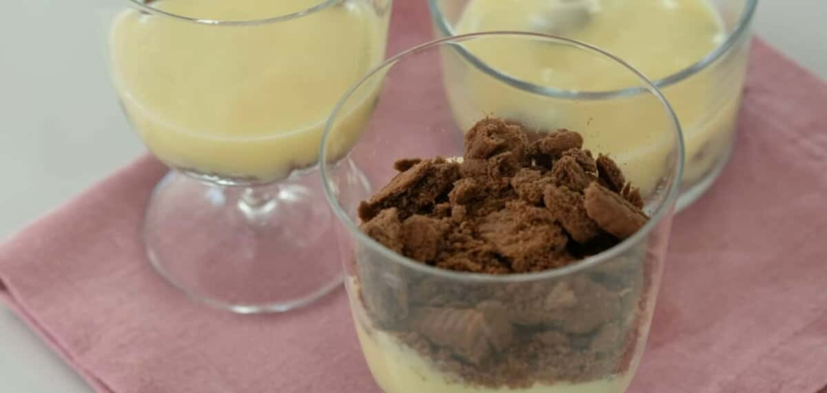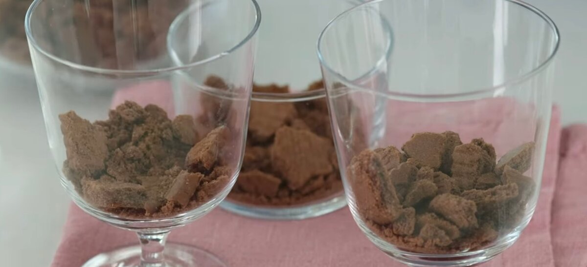 Печиво ( у мене шоколадне ) ламаємо руками, роблячи крихти. Викладаємо крихти в дно форм ( де будуть десерти ).