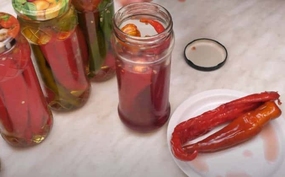 - А зараз хочу показати вам баночку з торішнім перцем, спеціально одну залишила для вас. Ось так він прекрасно тримає форму, він щільний, при цьому кисло-солодкий, гостренький, соковитий, дуже ароматний і нереально смачний! Зберігала я його в холодильнику, але в цей раз хочу спробувати при кімнатній температурі. Нагадаю, що в тому році я заливала його червоним винним оцтом.