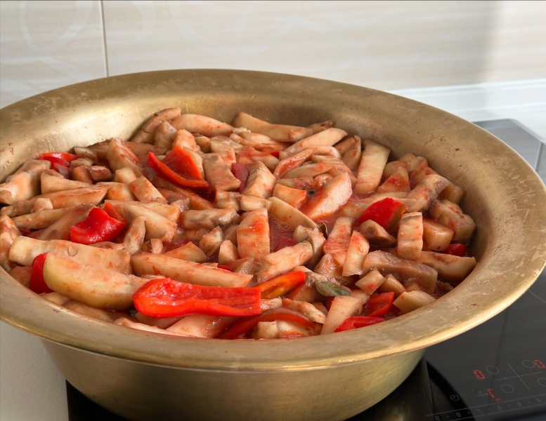 Коли заправка добре закипіла, відправляємо туди почищені і порізані великими брусочками баклажани і солодкий перець.