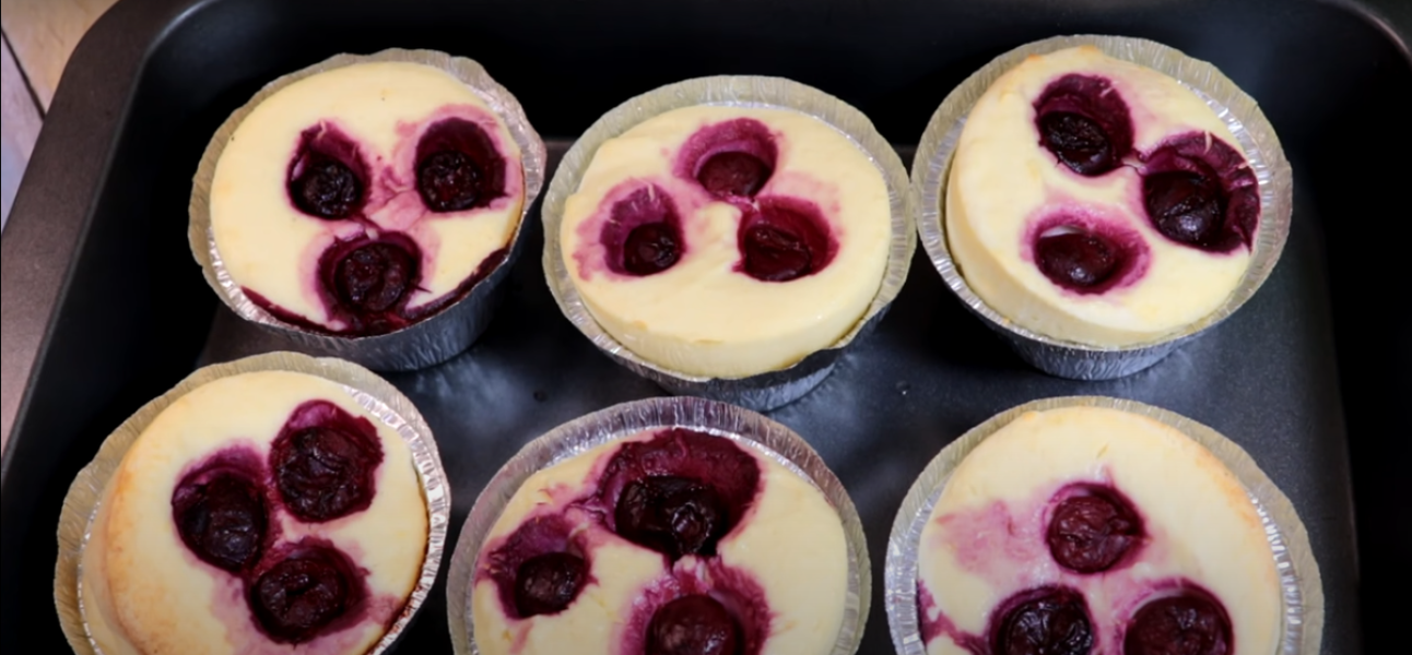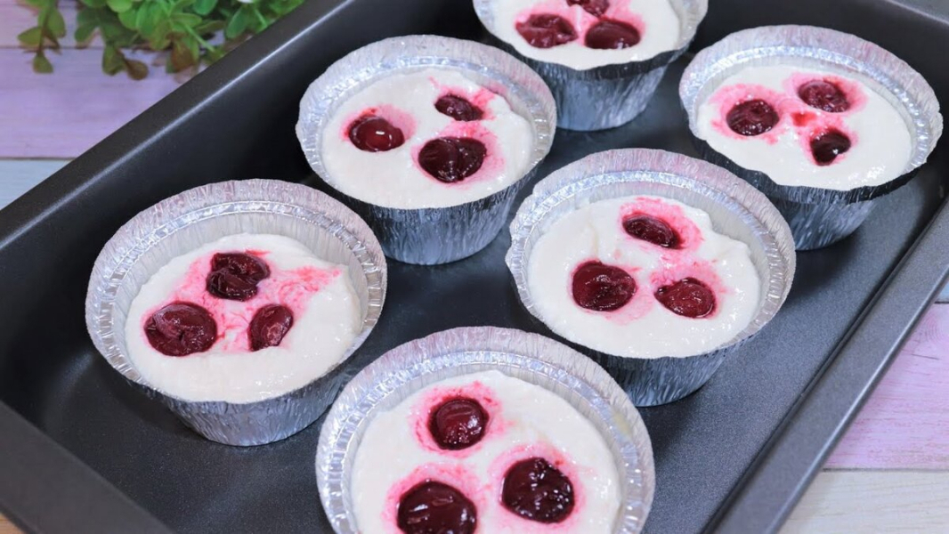 Кожну форму наповнюємо сирною масою, не доходячи до краю буквально пів сантиметра. Зверху викладаємо кілька шматочків вишні – всього знадобилося 100 гр. Ви можете брати як заморожені, так і свіжі ягоди.