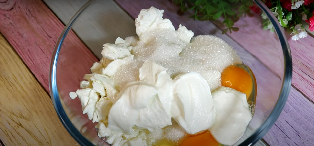 Спочатку беремо 350 гр. сиру будь-якого відсотка жирності. Звичайно, чим нижчий цей відсоток, то дієтичнішим вийде сам десерт. Додаємо туди щіпку солі та розбиваємо два середні яйця. Для додаткового смаку та аромату додаємо 10 гр. ванільного цукру.