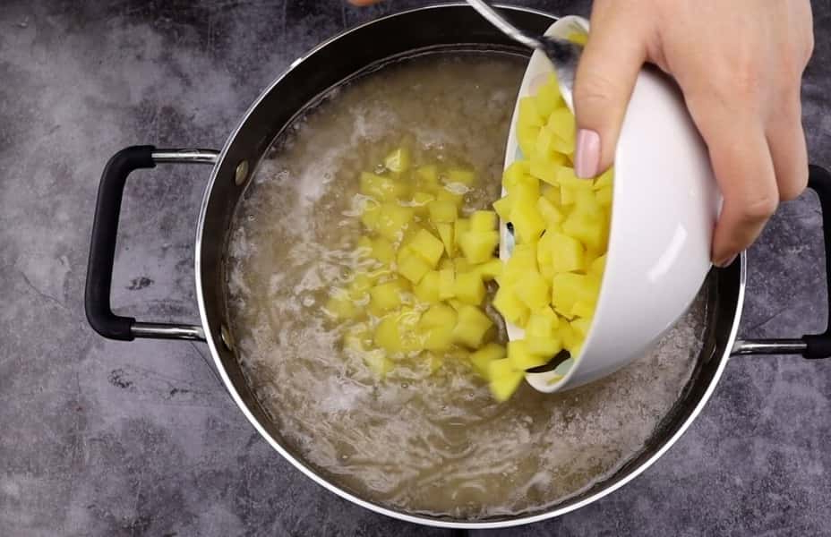 Минуло 40 хвилин, перловка практично готова. Додаємо до неї картоплю. Я нарізаю її на маленькі кубики, щоб вона швидше зварився. Перемішуємо, всипаємо сіль та дивимося на густоту супу. За потреби додатково вливаємо воду. Я влила ще півлітри.