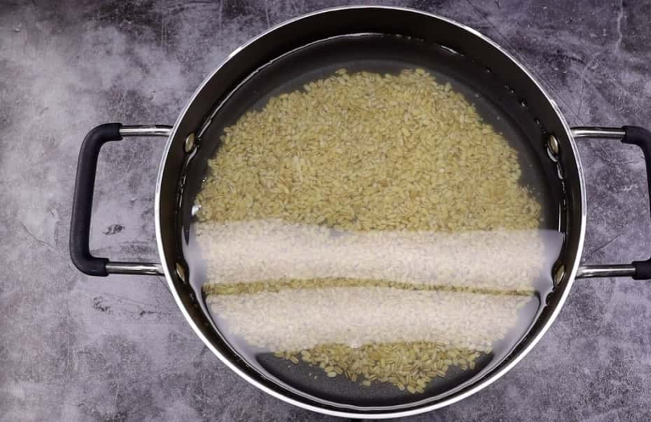 Доводимо до кипіння, знімаємо пінку, що утворилася, зменшуємо вогонь і варимо крупу 40 хвилин. А тим часом підготуємо решту інгредієнтів і зробимо заправку.