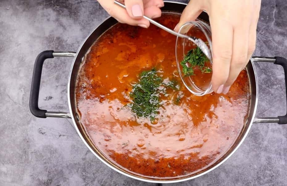 Як тільки картопля стала м’якою кладем у суп томатну заправку, перемішуємо та варимо суп ще 2 хвилини. Потім за бажанням кладемо свіжий подрібнений кріп і проварюємо суп 1 хвилину. Вимикаємо вогонь, накриваємо кришкою та даємо настоятися 10-15 хвилин.