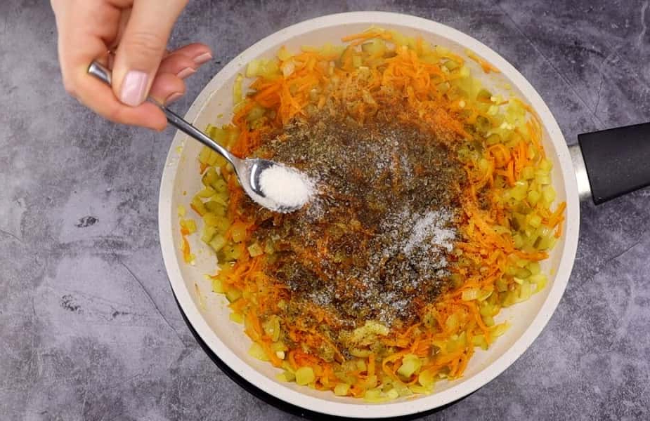 Тепер додаємо спеції: сіль та чорний мелений перець кладемо за смаком, також всипаємо 1 ч. л. сушеного базиліка або орегано та 1 ч. л. цукру. Добре перемішуємо і даємо їм буквально 2 хвилини протушитися, щоб спеції почали розкриватися та віддавати весь свій аромат овочам.