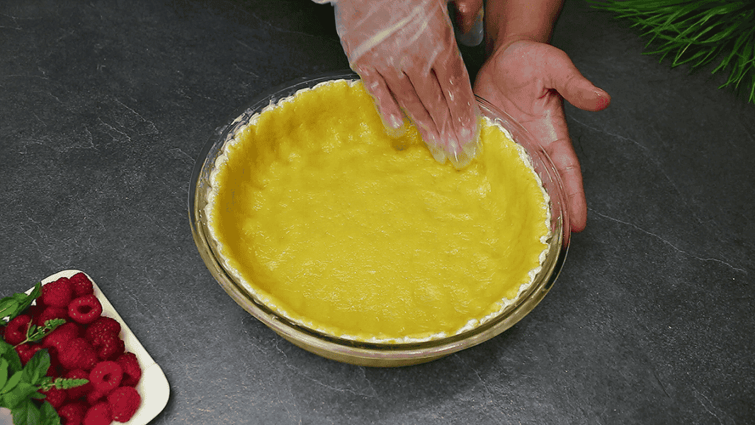 Викладаю його в змащену олією форму і рівномірно розподіляю по формі, роблячи бортики.