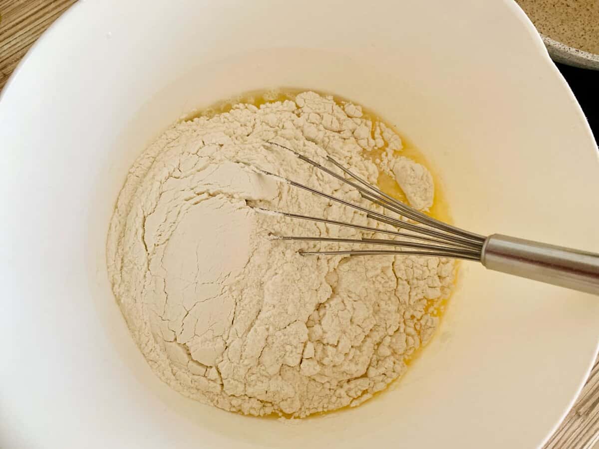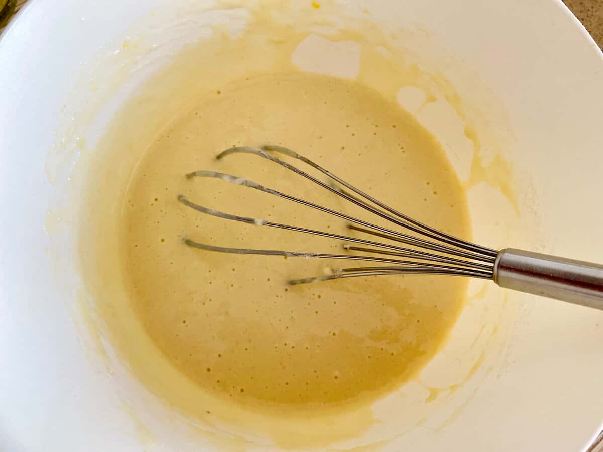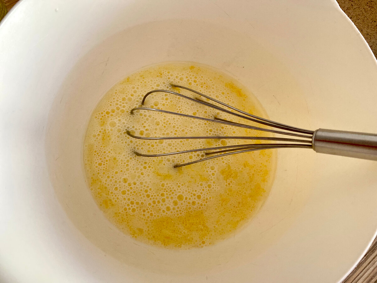 У мисці з’єднати молоко, яйце, цукор і олію, перемішати вінчиком.
