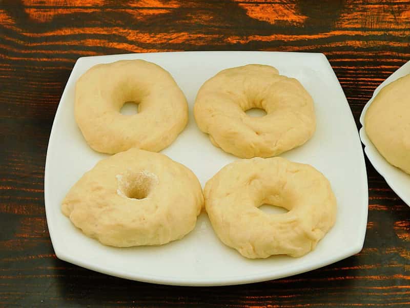 Занурити палець в борошно і зробити в центрі кожного колобка отвір. Так сформувати пончики.