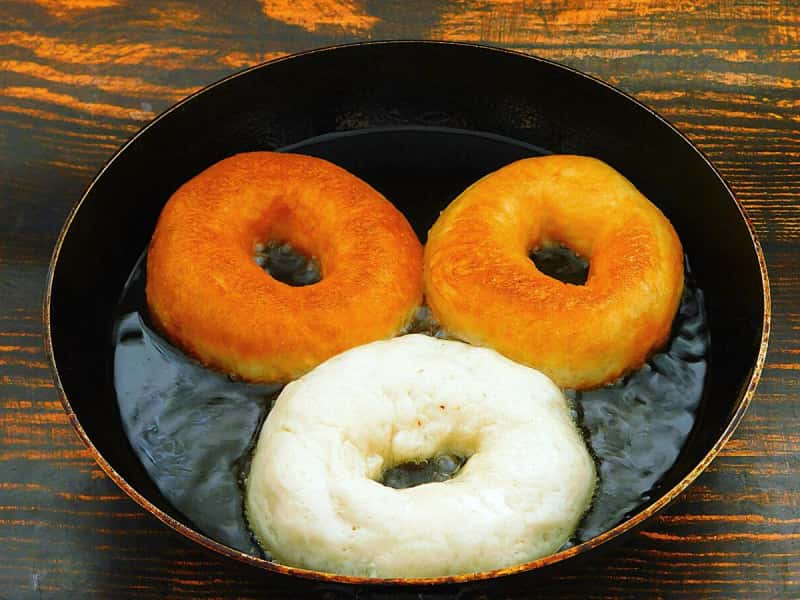 У сковорідці розігріти олію, викласти заготовки, щоб вони вільно плавали. Смажити на середньому нагріванні, як зарумяняться – перевернути. Майте на увазі, що пончики збільшуються в розмірах.