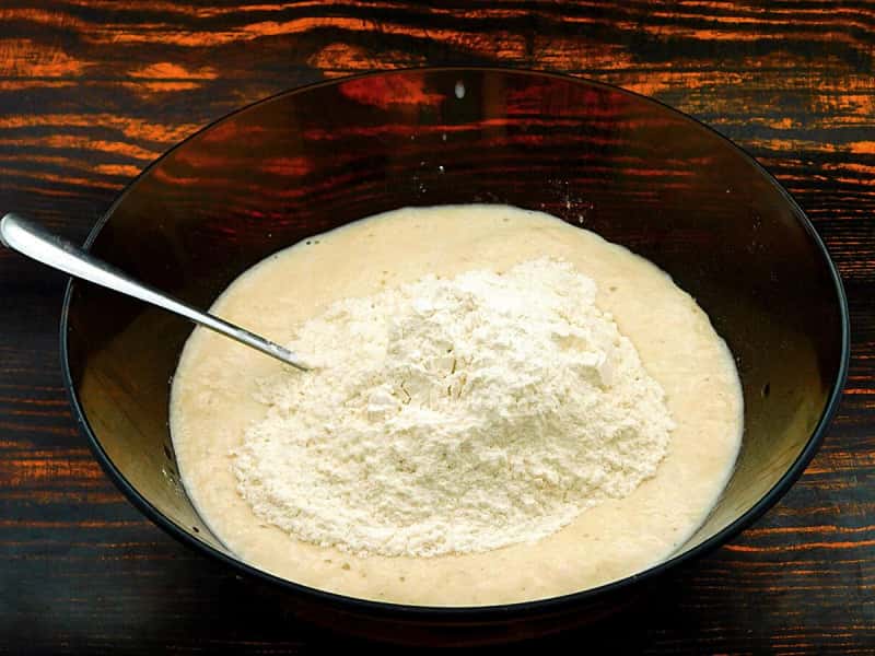 Влити теплу воду і перемішати, щоб все добре розчинилося. Додати 100 н борошна із загальної кількості.