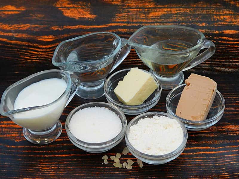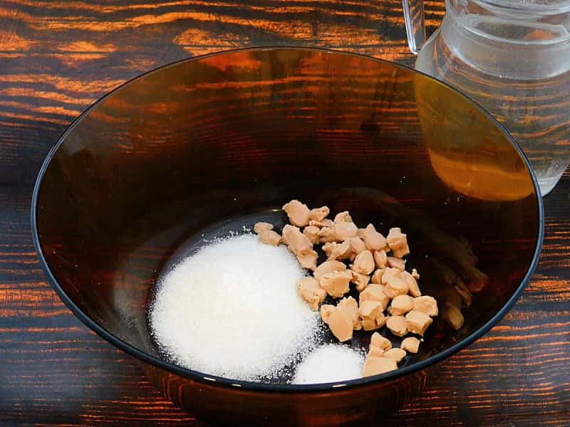 У миску всипати цукор, сіль, розкрошити свіжі дріжджі.