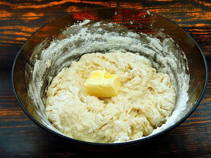 Далі продовжити руками, вмішувати спочатку масло, а потім і решту борошна. Працювати не менше 5 хвилин до набуття тістом еластичності. Накрити харчовою плівкою і залишити в теплому місці на 20 хвилин.
