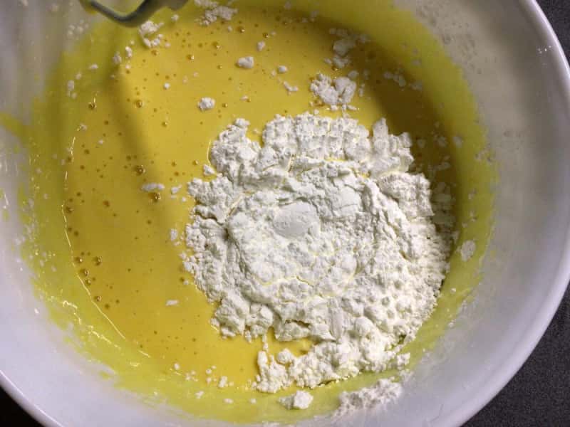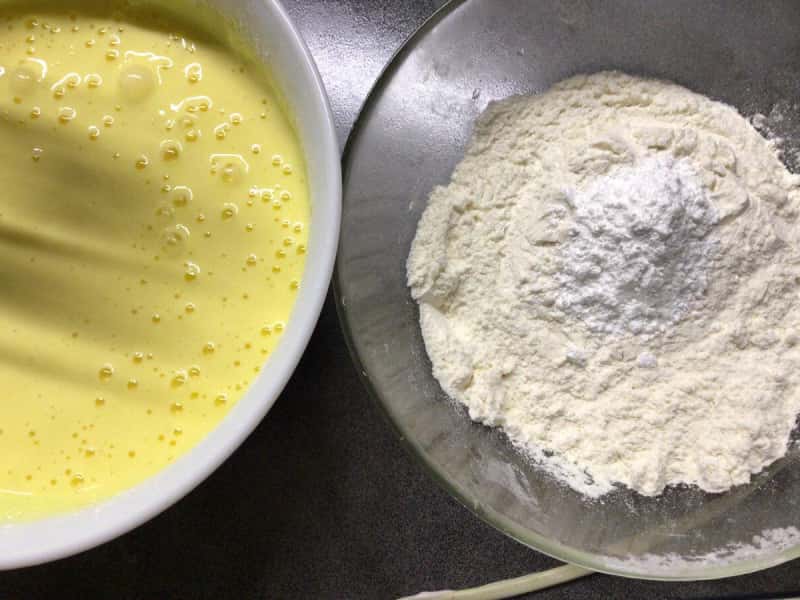 Змішуємо борошно з розпушувачем і додаємо в яєчну масу.