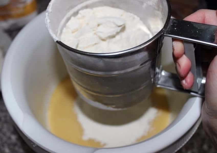 - Потім додаємо картоплю. Після цього борошно, що просіяне, тісто виходить дуже м’яке, податливе.