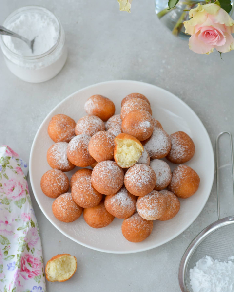 Пончики збільшуються у розмірах і стають рівними та красивими. Готові пончики викласти на паперову серветку, посипати цукровою пудрою.