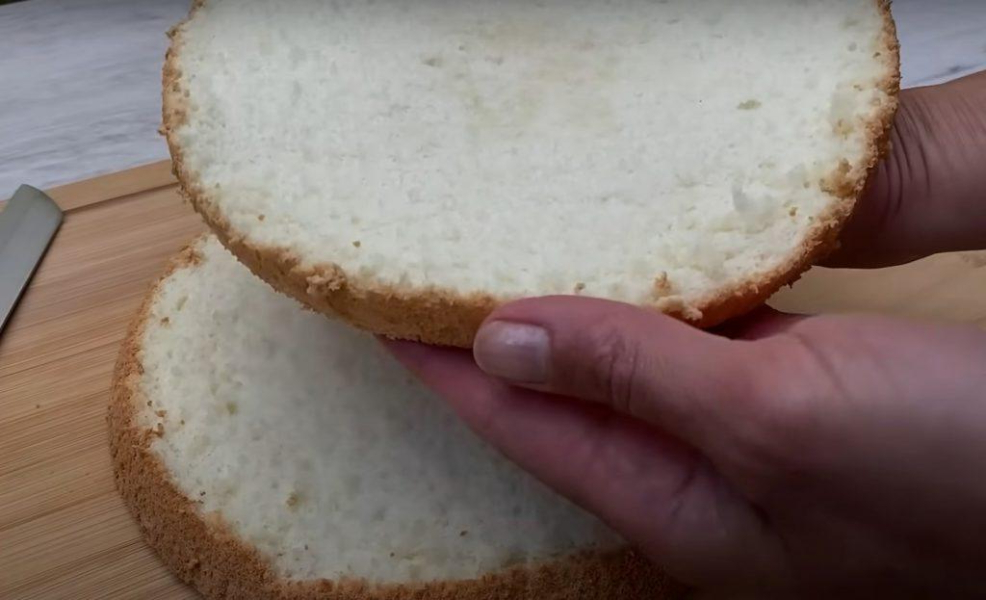 Розділяємо охолоджений бісквіт на дві половини.
