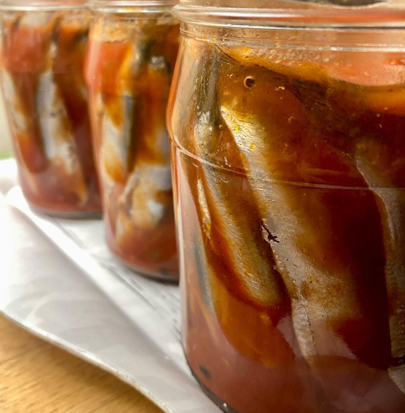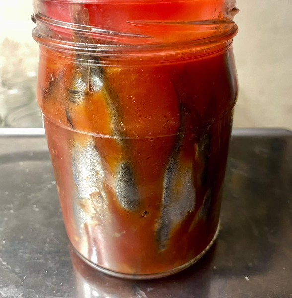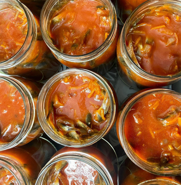Кілька у томаті в автоклаві. Такої смачної кільки я ніколи не їла! Рибка до рибки, солоденький соус і жодної печії. Зауважте, ніякого борошна! Кільку беру цілком, не потрошу, з головою. Жодної гіркоти немає – перевірено вже роками!!!