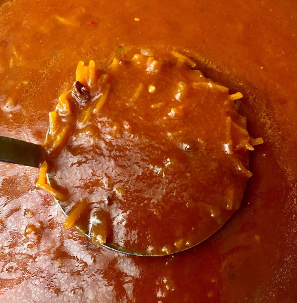 2. Соус. Обсмажуємо на олії цибулю, моркву. Додаємо часник і смажимо ще 1 хвилину. Додаємо пасту, паприку, воду, сіль, цукор. Доводимо до кипіння і тушкуємо пару хвилин.