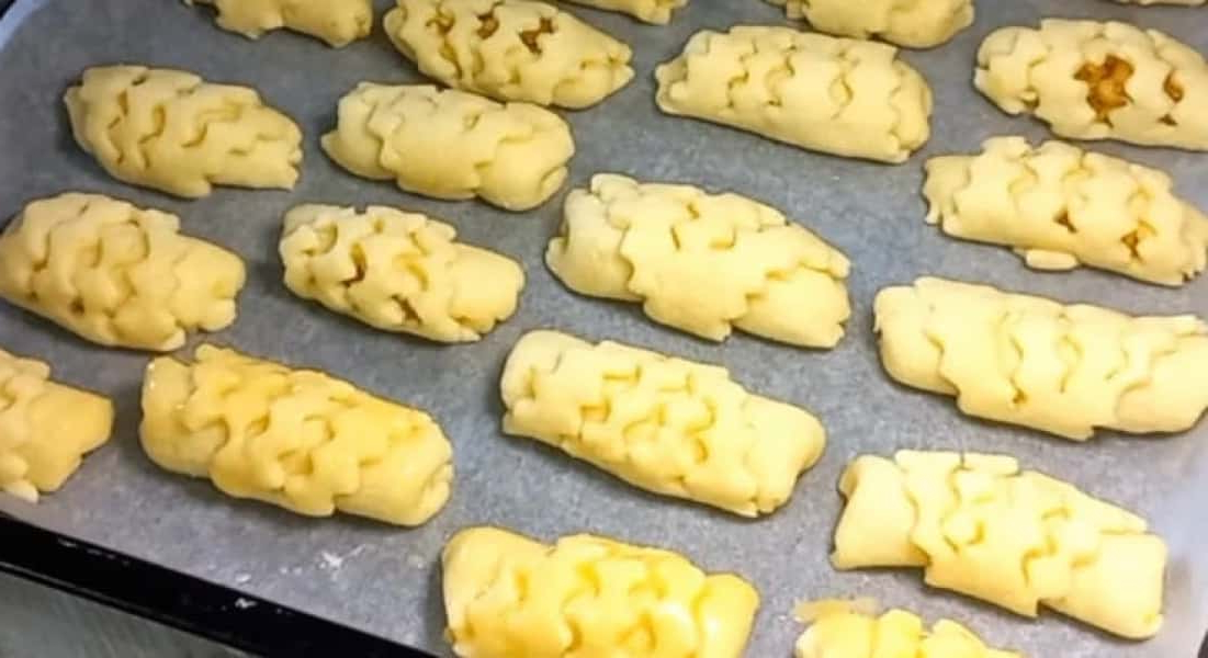 Загортаємо в трубочки і викладаємо на деко. Змащуємо збитим яйцем і запікаємо 25-30 хвилин при 180 градусах.
