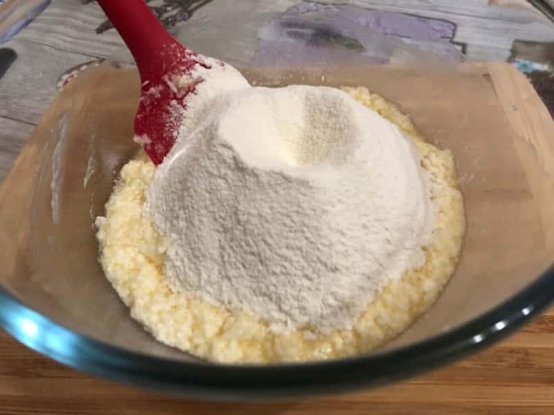 - Борошно змішуємо з розпушувачем і просіюємо до решти інгредієнтів, замішуючи тісто.