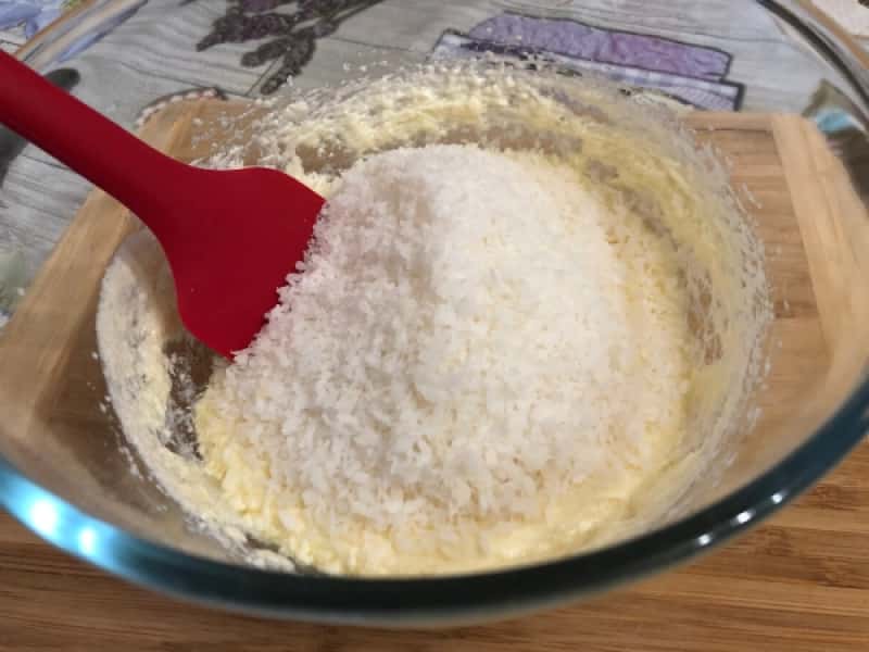 - Додаємо кокосову стружку і перемішуємо лопаткою.
